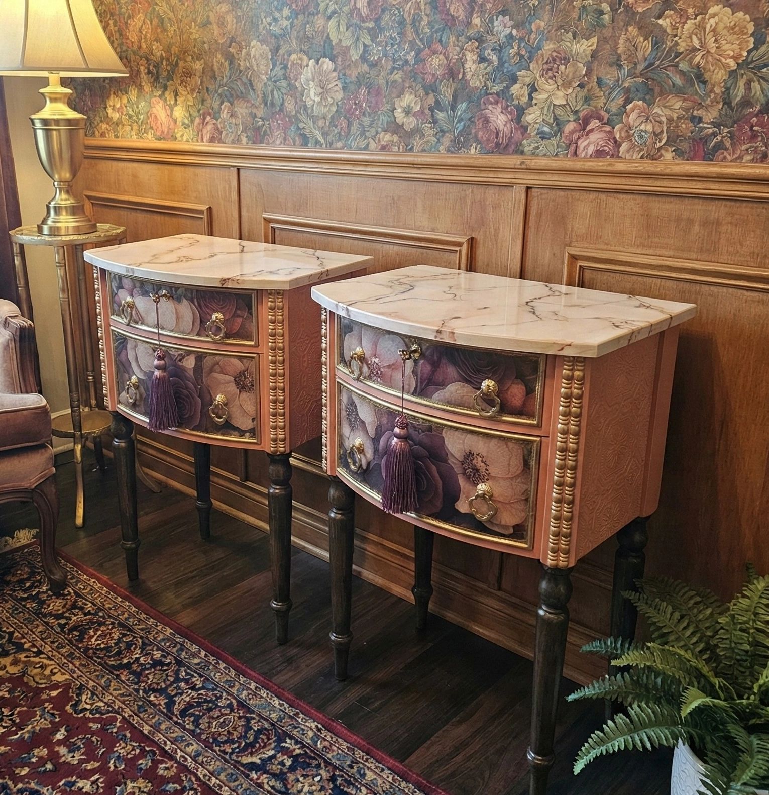 This sophisticated pair of bedside tables presents a harmonious blend of classic form and artistic embellishment, ideal for adding a touch of vintage glamour to any interior.