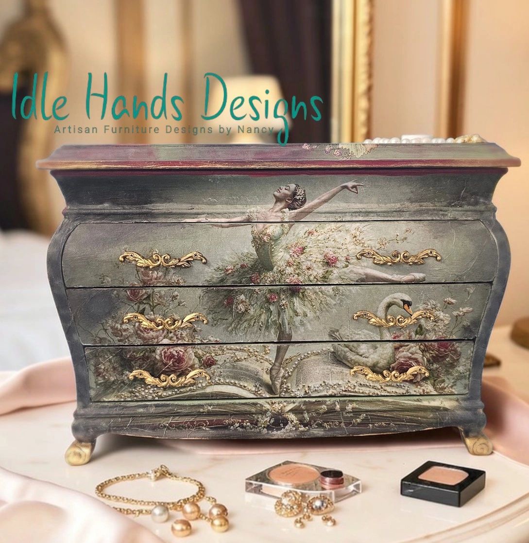 This vintage bombe jewelry chest has been reborn as a tribute to the grace of the prima ballerina. From the delicate pearl appliqué on the lid to the hidden floral mirror inside, she’s ready to hold your most precious treasures. A true one-of-a-kind statement for the romantic soul.