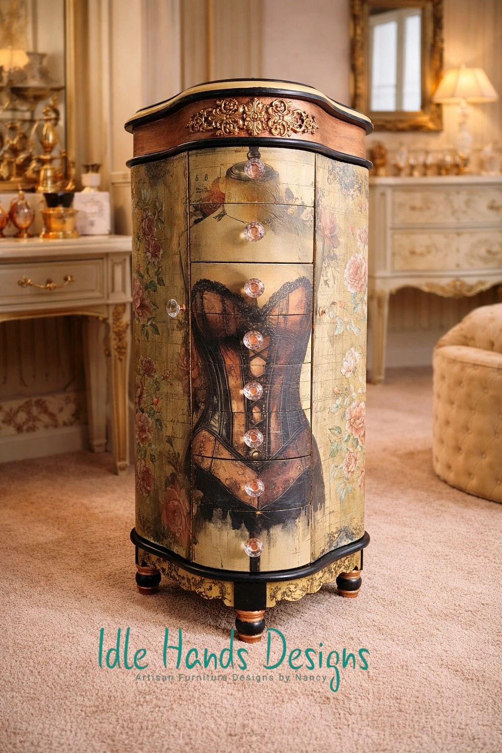 This striking 8-drawer jewelry tower is a one-of-a-kind statement piece. The exterior features a bold vintage corset motif framed by soft floral bouquets, the clover-shaped top is finished in a gold-studded harlequin pattern. Each drawer is adorned with crystal-style knobs and opens to reveal all-new, felt lining, complemented by two hidden side wings for necklace storage. Finely detailed with gilded baroque trim.